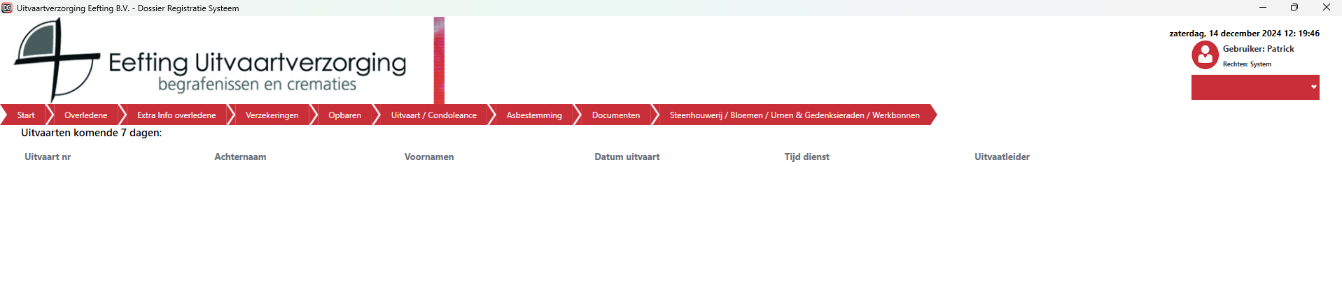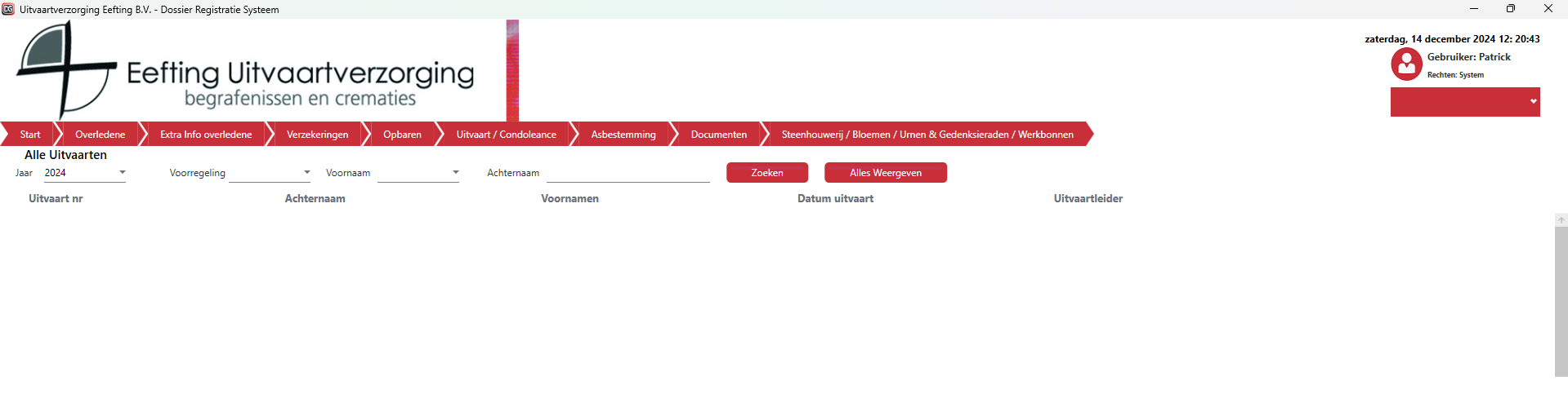 Alle uitvaarten laat een overzicht zien van alle uitvaarten die in het systeem zitten.