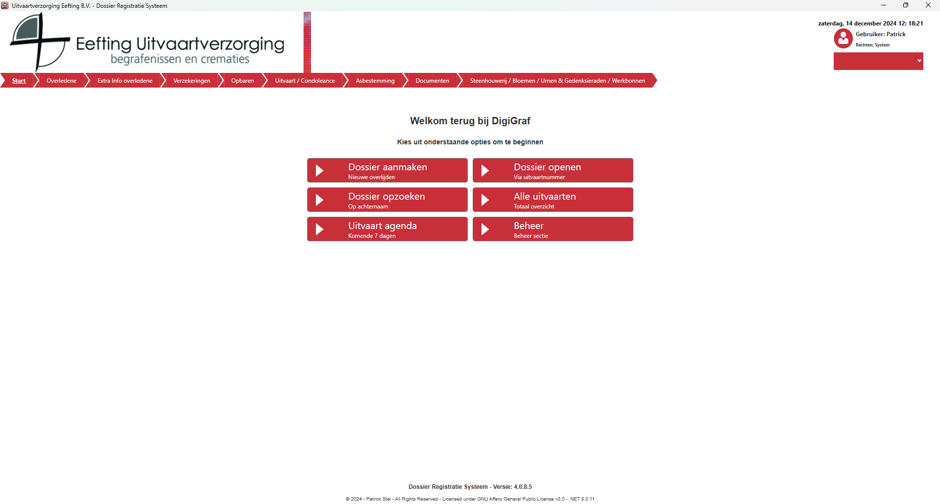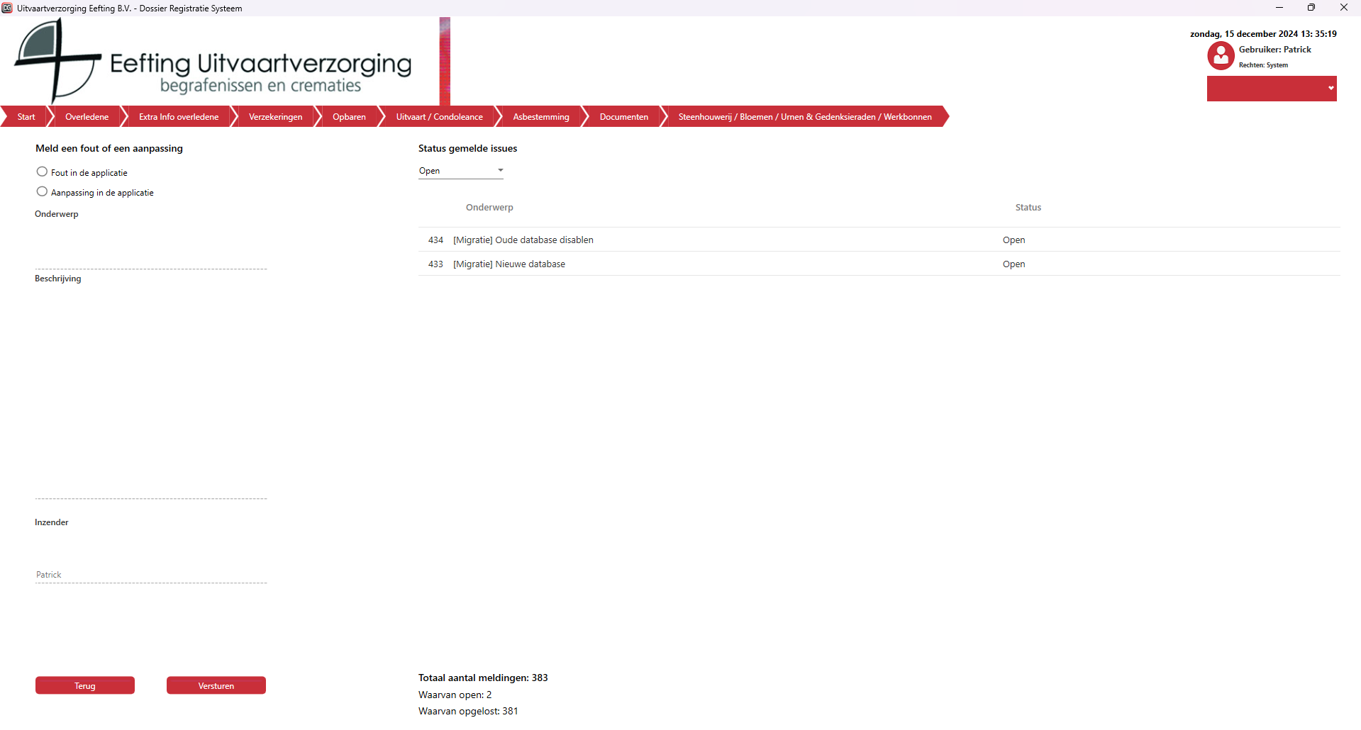 | Alle uitvaarten (Totaal overzicht) | Geeft een overzicht van alle uitvaarten in het systeem |