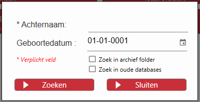 Wanneer er voor “Dossier opzoeken” gekozen is dan wordt er om een Achternaam en Geboortedatum gevraagd,