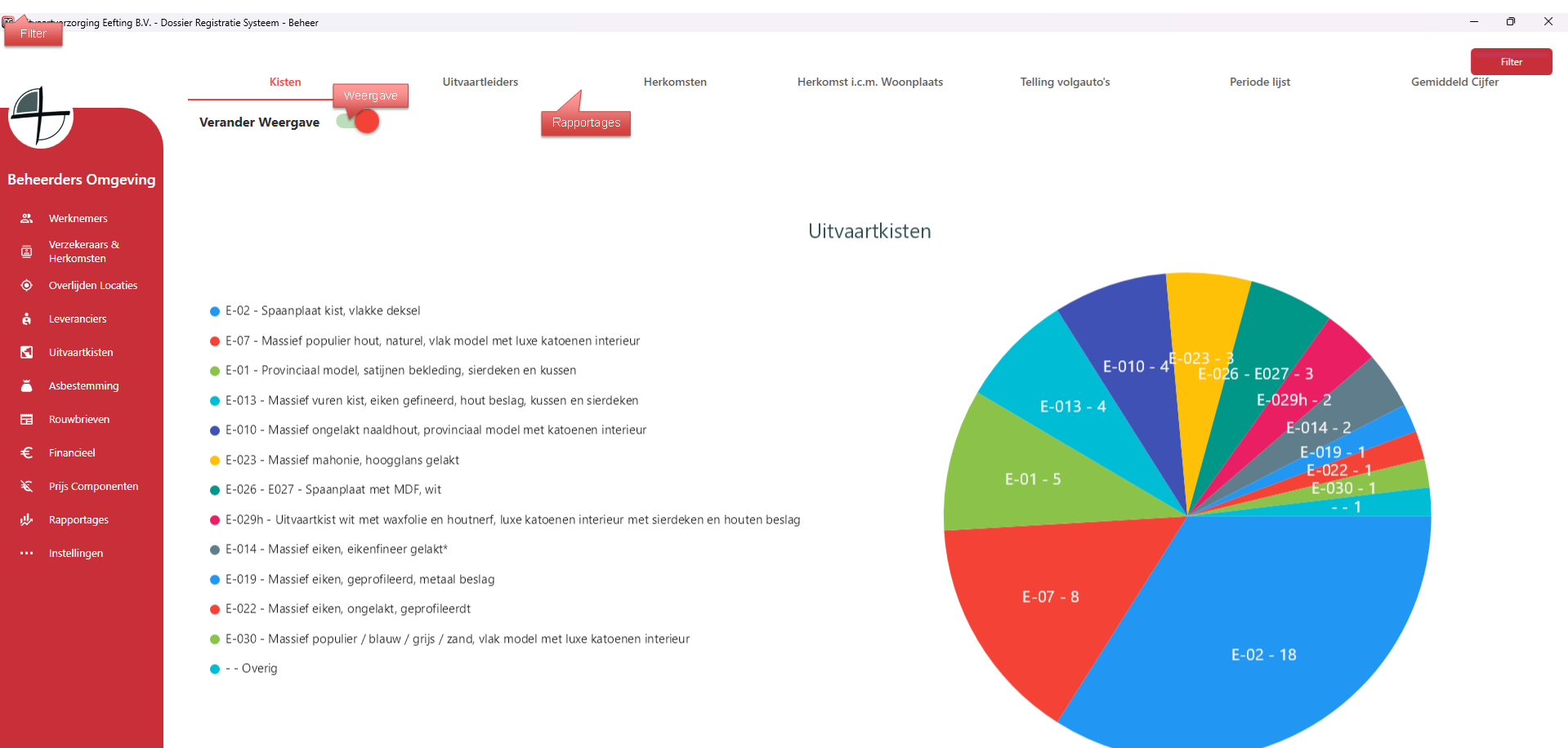 Via rapportages kun je de benodige rapportages en statestieken bekijken over welke uitvaart, welke herkomsten, welke kisten etc.